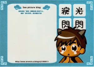 就說沒騙你,他的卡片真的很可愛!如果你有想要的話,一套三張,包含了淚光閃閃、笑口常開及失魂落魄一次一起帶回家哦!而且又能做好事,何樂不為呢?參加網址:http://www.wretch.cc/blog/o2190911/5433750。