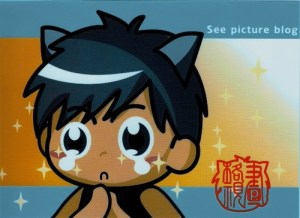 沒錯,我又很光明正大的拖稿了!這回我要介紹小犬的規格畫!小犬也是堂本伸先生,他的網誌正在推買他的酷卡抽獎送「小犬馬克杯」活動!他的酷卡都是跟成語有關的!例如:淚光閃閃、笑口常開及失魂落魄!而且圖片超可愛!他的活動真的不錯哦!因為你買東西他還會捐五元給門諾基金會!真是有愛心的小犬!剛好有他一套中的一張酷卡,先給大家看一下,你再決定要不要參加他的活動!