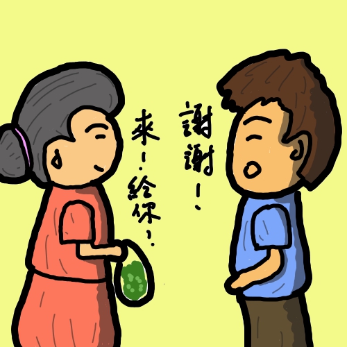 後來有一位老婆婆可能看我沒搶到很可憐,就把別人搶到給他的兩把空心菜轉送給我。我就一直跟她說謝謝!