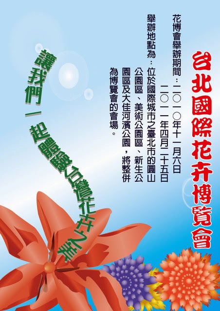 花博會,台灣花卉的驕傲~ 西元2009-11-28西元2020-05-29 tobitsao12 則迴響 明天二零一零年台北就要舉辦花卉博覽會了!花卉博覽會將要把台灣的花卉介紹給全世界,也把全世界的花卉介紹給台灣。這麼有意義的活動,大家不幫忙宣傳,就太不夠意思囉!!請大家告訴大家,台灣的花博會即將在明年的十一月六日展開。不到一年了,希望到時大家能一起參觀~~,一同來見證台灣的花卉最美麗的容顏!!